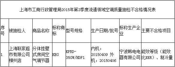 10日,上海市工商行政管理局在其官網(wǎng)公布空調(diào)質(zhì)量抽檢情況,標(biāo)稱商標(biāo)為“KEG”的一個(gè)批次分體掛壁式房間空氣調(diào)節(jié)器被檢出不合格。 近期,上海市工商局集中組織力量對徐匯區(qū)、楊浦區(qū)、嘉定區(qū)、松江區(qū)等部分區(qū)域19家超市、1家商場銷售的20個(gè)批次各種類型掛壁式、落地式、定頻、變頻等空調(diào)進(jìn)行了市場檢查和質(zhì)量抽檢。經(jīng)檢測,有1個(gè)批次不合格,不合格項(xiàng)目是能效等級(能效比)和制冷量。 抽檢發(fā)現(xiàn),上海聯(lián)家超市有限公司柳州店銷售的標(biāo)稱由寧波韓電電器有限公司生產(chǎn)的“KFG”牌分體掛壁式房間空氣調(diào)節(jié)器(型號規(guī)格:KFRD-35GW/HDF1;生產(chǎn)日期或批號:內(nèi)機(jī)20150409、外機(jī)20150406),能效等級實(shí)測為2.45(w/w)(企業(yè)標(biāo)稱能效等級為3級,標(biāo)準(zhǔn)要求應(yīng)≥3.20(w/w))。 據(jù)介紹,空調(diào)能效等級分成1、2、3三個(gè)等級。能效等級越高(1級最高),能耗越少,越省電。通過能效等級高低,消費(fèi)者可以清楚的了解能耗情況。虛標(biāo)能效等級,容易誤導(dǎo)消費(fèi)者,違背了消費(fèi)者購買節(jié)能產(chǎn)品的初衷。 抽檢還發(fā)現(xiàn),該批次空氣調(diào)節(jié)器制冷量實(shí)測為80.1%(標(biāo)準(zhǔn)要求實(shí)測制冷量不小于額定制冷量的95%(額定制冷量為3500W))。制冷量即制冷能力,該指標(biāo)不合格,雖然不會(huì)產(chǎn)生安全隱患,但降低了空調(diào)的使用效果,影響消費(fèi)者正常使用。 根據(jù)抽檢結(jié)果,工商部門已責(zé)令相關(guān)經(jīng)營者立即下架并停止銷售不合格商品,依法對銷售不合格商品的經(jīng)營者立案調(diào)查。同時(shí),工商部門提醒消費(fèi)者在選購空調(diào)時(shí)要注意以下幾點(diǎn): 一、空調(diào)是國家3C強(qiáng)制認(rèn)證產(chǎn)品,所有在售商品均應(yīng)在顯著位置加貼3C認(rèn)證標(biāo)志。消費(fèi)者購買時(shí)應(yīng)注意查看3C標(biāo)志,并選擇售后服務(wù)完善的品牌企業(yè) 二、空調(diào)的能效等級分為三級,其中,1級最節(jié)能,3級最耗電。消費(fèi)者購買空調(diào)時(shí),要認(rèn)準(zhǔn)能效標(biāo)識和標(biāo)注的等級。