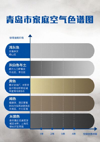 4月15日,海爾自清潔空調(diào)對(duì)外公布了一份“青島市家庭空氣色譜圖”。這是自2015年12月24日起至今,海爾“集塵行動(dòng)”走進(jìn)青島七區(qū)五市對(duì)1838個(gè)家庭抽樣進(jìn)行空調(diào)免費(fèi)清洗過程中采集到的灰塵標(biāo)本而制成。從這張“空氣色譜圖”來看,青島七區(qū)五市家庭采集到的灰塵基本呈現(xiàn)五種顏色:淺灰、灰白、灰黑、黃色、褐色。