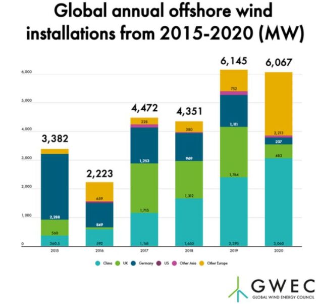 據(jù)全球風(fēng)能理事會GWEC(Globle Wind Energy,GWEC)最新報告,2020年,全球新增海上風(fēng)電裝機容量的一半來自中國。 絲路中心(BRICC)觀察到,海上風(fēng)電已是全球能源投資的熱點產(chǎn)業(yè)。目前海上風(fēng)電發(fā)展目前是什么態(tài)勢?全球資源情況如何?今后將如何發(fā)展?我們應(yīng)該采取什么策略? 本篇文章,絲路中心(BRICC)根據(jù)公開資料對以上問題進行分析,并提出相應(yīng)的工作建議。 文章要點 •全球海上風(fēng)電發(fā)展呈現(xiàn)進入爆發(fā)期。后續(xù)還會有越來越多的國家出臺支持政策,發(fā)展還將加快。中國連續(xù)三年海上風(fēng)電新增裝機量處于世界領(lǐng)先地位,2020年新增海上風(fēng)電裝機量超過3GW,占全球增量一半以上。 •中國近年已經(jīng)成為全球海上風(fēng)電發(fā)展的領(lǐng)頭羊,今后還將繼續(xù)加大力度。歐洲國家,韓國、越南等亞洲國家也在持續(xù)發(fā)力。 •全球海上風(fēng)電具有巨大的發(fā)展空間。隨著單機容量不斷增大、制造和安裝成本的持續(xù)下降,海上風(fēng)電將越來越具備商業(yè)競爭價值。 •在一些海上風(fēng)電資源豐富的國家,在其政策將明未明之時,及時搶占資源好的風(fēng)電場并連續(xù)開發(fā),是當(dāng)前海外電力投資的重要方向。 •未來提高競爭力,海上風(fēng)電+儲能、海上風(fēng)電+制氫等模式,也是應(yīng)該考慮的可持續(xù)發(fā)展模式。 1 中國海上風(fēng)電行業(yè)進入爆發(fā)期 根據(jù)全球風(fēng)能理事會(Global Wind Energy Council,GWEC)發(fā)布的最新數(shù)據(jù)顯示,2020年全球海上風(fēng)電新增裝機量超過6GW,盡管受到新冠疫情影響,但風(fēng)電發(fā)展在能源行業(yè)中保持良好勢頭,成為有史以來第二好的年份,詳見圖1、表1。 總體而言,目前全球海上風(fēng)電裝機總?cè)萘恳殉^35GW,在過去5年中增長了106%,詳見圖2、表2。