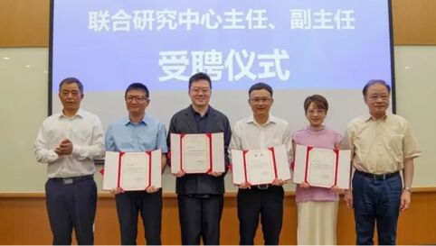 中國(guó)科學(xué)院院士馬余剛(左一)、褚君浩(右一)為聯(lián)合研究中心負(fù)責(zé)人頒發(fā)聘書(shū)