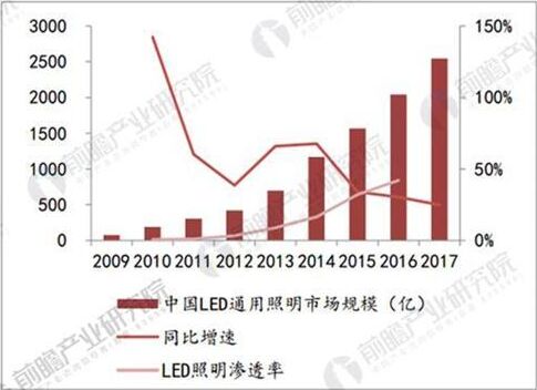LED照明即是發(fā)光二極管照明,是一種半導體固體發(fā)光器件。它是利用固體半導體芯片作為發(fā)光材料,在半導體中通過載流子發(fā)生復合放出過剩的能量而引起光子發(fā)射,直接發(fā)出紅、黃、藍、綠色的光,在此基礎上,利用三基色原理,添加熒光粉,可以發(fā)出任意顏色的光。 全球LED行業(yè)方興未艾,智能照明大勢所趨 基于LED光源與傳統(tǒng)光源相比發(fā)光效率高、易受控制、使用壽命長、污染低等特性,近年來照明行業(yè)正處在革命性更新?lián)Q代時代。2009-2015年間,全球LED照明滲透率增速不減,由1.5%穩(wěn)步增長至27.2%,趨勢仍將繼續(xù)。2016年,全球LED照明市場規(guī)模已達346億美元,同增15.80%,市場增速居高不下,有望繼續(xù)保持強勁增長趨勢。 中國LED滲率不斷提升,驅動市場高速發(fā)展 據前瞻產業(yè)研究院發(fā)布的《LED照明產業(yè)市場前瞻與投資戰(zhàn)略規(guī)劃分析報告》數據顯示,中國LED照明行業(yè)規(guī)模從78億元擴張超過2550億元,09-17年CAGR高達54.62%,LED通用照明市場的快速擴張,主因是通用照明行業(yè)的擴張與LED照明滲透率的提升,LED照明滲透率由2010年的0.6%升至2016年的42%。我們認為受益于LED燈的政策扶持和節(jié)能需求提升,LED對傳統(tǒng)燈源的替代效應有望持續(xù)釋放,LED滲透率仍將繼續(xù)提升,推動LED通用照明行業(yè)保持快速增長。