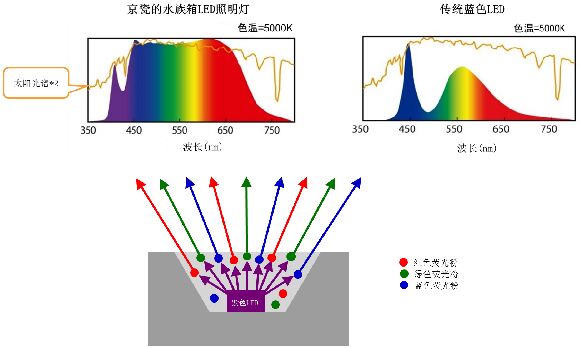 京瓷的水族箱LED照明燈于8月中旬在日本市場(chǎng)推出以下4種類(lèi)型的產(chǎn)品: • 海藍(lán)色:營(yíng)造海平面下2.5m深處的太陽(yáng)光譜 • 水藍(lán)色:營(yíng)造海平面下11m深處的太陽(yáng)光譜 • 自然白:營(yíng)造類(lèi)似地面上陽(yáng)光的光譜 • 深藍(lán)色:適合觀賞用途 產(chǎn)品特性 1. 燈泡發(fā)出的模擬自然光有助于珊瑚和水生植物生長(zhǎng) 京瓷的高顯色LED通過(guò)紫色LED和RGB三原色熒光體的組合技術(shù),可以營(yíng)造出非常接近自然光的光線。還可以通過(guò)定制光譜,營(yíng)造出在特定水下深度接近珊瑚和水生植物自然棲息地的光線。