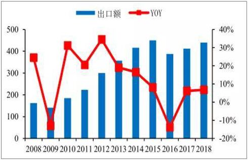 2008-2018年中國照明電器行業(yè)出口及增速趨勢(數(shù)據(jù)來源:公開資料整理)