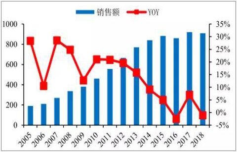 2005-2018年中國照明電器行業(yè)銷售額(億美元)(數(shù)據(jù)來源:公開資料整理)