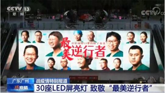 從2月17日開始,廣東廣州中心城區(qū)的30座LED大屏投影出了多幅“最美逆行者”的照片,為奮戰(zhàn)在湖北疫情一線的醫(yī)務(wù)人員送上鼓勵和祝福。