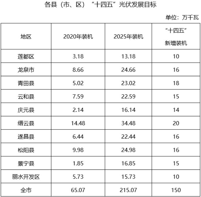 全面貫徹黨的十九大和十九屆二中、三中、四中、五中全會精神,認(rèn)真落實(shí)國家和省碳達(dá)峰碳中和工作部署,牢牢把握生態(tài)文明建設(shè)要求,加強(qiáng)統(tǒng)籌協(xié)調(diào),創(chuàng)新發(fā)展模式,加快調(diào)整優(yōu)化能源結(jié)構(gòu),以分布式光伏整縣(市、區(qū))規(guī);_發(fā)為抓手,全面實(shí)施“光伏+”工程,推動(dòng)綠色低碳能源產(chǎn)業(yè)高質(zhì)量發(fā)展,著力打造華東綠色能源基地。力爭“十四五”全市新增光伏發(fā)電150萬千瓦,其中市區(qū)(含蓮都區(qū)、麗水經(jīng)濟(jì)開發(fā)區(qū))新增光伏發(fā)電20萬千瓦。