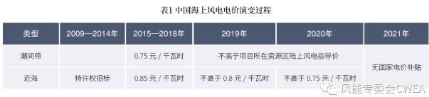 2015年以前,我國海上風(fēng)電電價(jià)政策基本上以特許權(quán)招標(biāo)為主。隨著2015年12月22日,國家發(fā)展改革委印發(fā)《關(guān)于完善陸上風(fēng)電光伏發(fā)電上網(wǎng)標(biāo)桿電價(jià)政策的通知》(下稱《通知》),我國開啟了海上風(fēng)電固定電價(jià)周期。《通知》首次明確了海上風(fēng)電潮間帶與近海項(xiàng)目的上網(wǎng)電價(jià),分別為0.75元/千瓦時(shí)、0.85元/千瓦時(shí)。