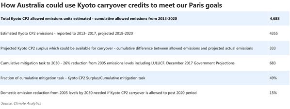 澳大利亞政府在巴黎協(xié)定框架內(nèi)承諾到2030年比2005年減少二氧化碳排放26%,即6.83億噸。在目前的政策趨勢情況下,澳大利亞難以完成這個減排目標(biāo)。但是,澳大利亞政府有關(guān)方面想出了一個達(dá)標(biāo)的聰明方法:用京東議定書下減排“超額”完成的減排量來補(bǔ)償巴黎協(xié)定下的減排目標(biāo)。具體來說著這樣算的:在京東議定書下澳大利亞在2013-2020年之間被“允許”的累計(jì)排放總量為46.88億噸;而根據(jù)目前的趨勢來預(yù)測,澳大利亞在2013-2020年間的排放總量為43.55億噸,因此“超額”完成量為3.33億噸。如果把京東議定書下的“超額”完成量計(jì)入巴黎議定書下的減排量,那么澳大利亞到2030年僅需再減排3.50億噸,也就是說到2030年比2005年減排下降15%就可以達(dá)標(biāo)。