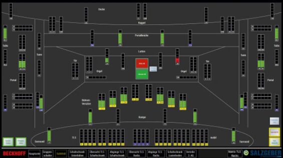 可視化元件基于 TwinCAT HMI 服務器(TF2000)實現(xiàn),并在一臺 C6515 控制柜式工業(yè) PC 上運行。用于顯示所有音頻設備狀態(tài)的 HMI 由一個 HMI 頁面上的大約 1000 個 PLC 變量組成,變量每 50 ms 更新一次,包括負責配電、狀態(tài)監(jiān)測和音頻信號的各種窗口!皩ξ覀儊碚f,可視化或視場的開發(fā)是最重要的方面之一,也是我們選擇與倍福合作的主要原因之一!盇thanasios Rovakis 表示!艾F(xiàn)在我們可以使用顯示器追蹤聲音位置。如果您在調音臺工作,在距離揚聲器較遠的情況下播放音頻信號時,您會收到四處擴散的噪聲,并且無法準確地分辨噪聲來源。這時候,HMI 中揚聲器音量表的 3D 排列就派上用場了!币纛l輸出可以通過控制室的物理按鍵、音頻控制臺以及 HMI 單獨靜音或全部靜音。在控制室中也會顯示功放的當前工作狀態(tài)。LED 燈帶可以產(chǎn)生柔和、宜人的間接光。藍色表示揚聲器處于靜音狀態(tài)。全自動控制室內的環(huán)境照明變?yōu)榧t色或燈光被調暗是演出即將開始的信號,可以提醒操作人員提高注意力。