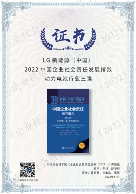 近日,由中國(guó)社會(huì)責(zé)任百人論壇主辦的“第十四屆《企業(yè)社會(huì)責(zé)任藍(lán)皮書(shū)》發(fā)布會(huì)暨ESG中國(guó)論壇2022冬季峰會(huì)”在京舉辦,LG新能源憑借在可持續(xù)發(fā)展領(lǐng)域的突出實(shí)踐與成效,在“動(dòng)力電池行業(yè)社會(huì)責(zé)任發(fā)展指數(shù)(2022)”排名蟬聯(lián)第一,更摘得“綠色環(huán)!必(zé)任金牛獎(jiǎng)。