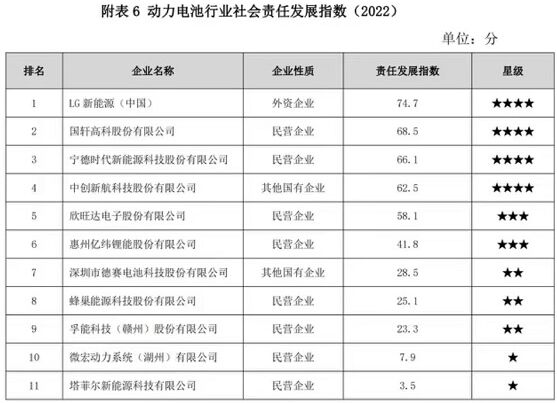 《企業(yè)社會(huì)責(zé)任藍(lán)皮書(shū)》由中國(guó)社會(huì)科學(xué)院社會(huì)責(zé)任研究中心編制,是目前中國(guó)企業(yè)社會(huì)責(zé)任領(lǐng)域最具影響力的研究成果!捌髽I(yè)社會(huì)責(zé)任發(fā)展指數(shù)(2022)”基于“通用指標(biāo)+行業(yè)特色指標(biāo)”評(píng)價(jià)體系,以企業(yè)性質(zhì)、所在行業(yè)為劃分標(biāo)準(zhǔn),對(duì)企業(yè)社會(huì)責(zé)任信息進(jìn)行內(nèi)容及定量分析的指數(shù)評(píng)價(jià)。LG新能源在綠色管理、綠色生產(chǎn)、綠色運(yùn)營(yíng)的環(huán)境責(zé)任版塊,伙伴、員工、社區(qū)的社會(huì)責(zé)任版塊,責(zé)任管理的責(zé)任融合版塊,以及本質(zhì)責(zé)任的客戶責(zé)任板塊摘取八項(xiàng)最高評(píng)分,總評(píng)分名列榜首。此次排名的蟬聯(lián)及獎(jiǎng)項(xiàng)的殊榮,既是對(duì)LG新能源在社會(huì)責(zé)任領(lǐng)域取得成效的有利認(rèn)可,也是對(duì)LG新能源作為動(dòng)力電池行業(yè)的領(lǐng)軍企業(yè),在可持續(xù)發(fā)展和綠色產(chǎn)能方面做出貢獻(xiàn)的肯定。