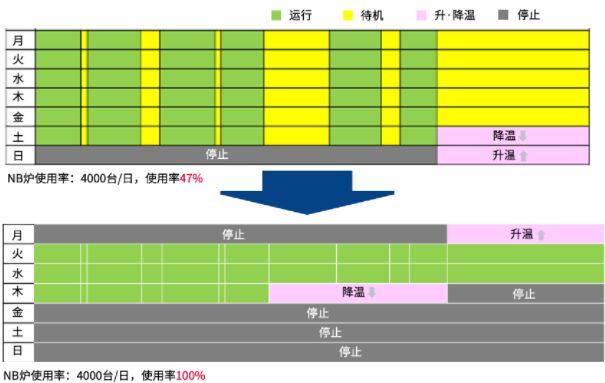 秉承著精益生產(chǎn),消除所有浪費的生產(chǎn)理念,電裝著手于提高能源利用效率,消除浪費的生產(chǎn)改善措施。通過將耗能最大的NB爐設(shè)備的生產(chǎn)狀態(tài)可視化并結(jié)合計劃進(jìn)行集中生產(chǎn),連續(xù)運行NB爐,削減待機時間。通過上述消除浪費的節(jié)能行動,NB爐的使用率從原本的47%提升至100%。大幅提高能源利用率和員工工作效率,減少工時和待機時間,從而促進(jìn)實現(xiàn)生產(chǎn)據(jù)點的降本增效。