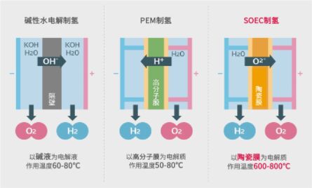 水產(chǎn)生氫的水電解方法有堿性水電解制氫、PEM(Polymer Electrolyte Membrane/固體高分子電解質(zhì)膜)制氫等幾種方式。由于水具備在溫度越高越能在低電壓下分解的性質(zhì),因此與在60℃左右反應(yīng)的堿性水電解制氫、PEM制氫不同,SOEC所使用的陶瓷材料可在約700℃高溫下反應(yīng),制氫所需的能耗也會(huì)對(duì)應(yīng)削減。