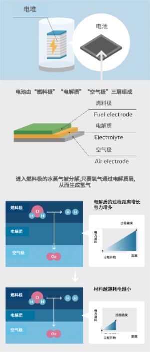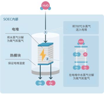 SOEC的電解模式是將該電堆放入用絕熱材料包裹的高溫機(jī)器“熱模塊”中,并向其中送入700℃高溫的水蒸氣來進(jìn)行電解。