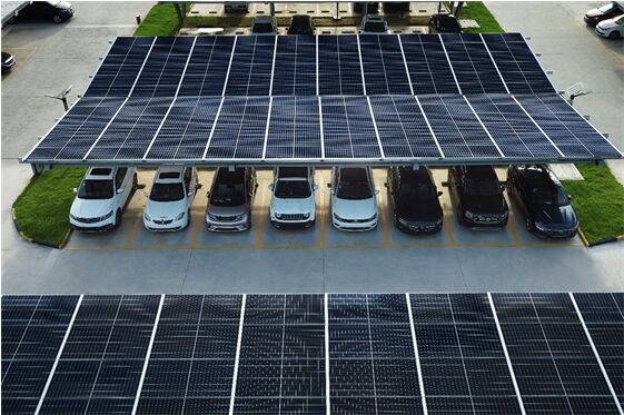 基地還打造了光伏停車(chē)棚,車(chē)棚與光伏發(fā)電完美結(jié)合,是太陽(yáng)能發(fā)電在社會(huì)生活應(yīng)用的環(huán)保示范。這一舉措,不僅解決了露天條件下停車(chē)的高溫問(wèn)題,還能利用車(chē)棚閑置空間進(jìn)行發(fā)電,自發(fā)自用,余電上網(wǎng),最大限度提高綠色清潔電力使用效率,集合了停車(chē)空間、屋頂發(fā)電、建筑美學(xué)三大功能。該光伏停車(chē)棚面積4614平方米,可容納220輛機(jī)動(dòng)車(chē)及400余輛非機(jī)動(dòng)車(chē),年發(fā)電量可達(dá)92萬(wàn)度。此外,基地還安裝了200盞太陽(yáng)能路燈,每年可節(jié)約3萬(wàn)度清潔電力,相當(dāng)于減少碳排放17.72噸。