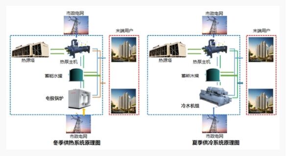 該項(xiàng)目中,能源中心的冷熱能供能范圍為北至環(huán)湖南一路,東至南港大道,南至環(huán)湖南二路,西至海港大道,總建筑面積約100萬平方米。項(xiàng)目地塊寸土寸金,屋面面積有限,周邊環(huán)境對(duì)噪音要求高,無法采用地(水)源熱泵、傳統(tǒng)空氣源熱泵等技術(shù)路線;燃?xì)鈨r(jià)格逐年遞增,燃?xì)忮仩t供熱成本太高;采用蓄能技術(shù),需要穩(wěn)定冷熱源。最終能源站采用多能互補(bǔ)的能源形式:熱源塔熱泵(離心熱泵系統(tǒng))+離心冷機(jī)+水蓄能+電鍋爐(備用),裝機(jī)熱負(fù)荷26MW,裝機(jī)冷負(fù)荷60MW。其中,熱源塔裝機(jī)熱負(fù)荷22MW,裝機(jī)冷負(fù)荷23.9MW。