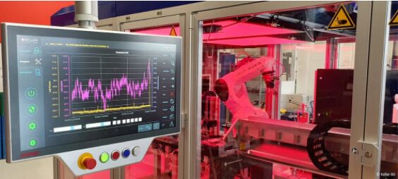 壓印是傳感器隔離膜片生產(chǎn)過程中一個(gè)不可或缺的的中間加工步驟,凱樂公司項(xiàng)目經(jīng)理 Florian Wernli 解釋道:“我們的大部分壓力傳感器都封裝在充油不銹鋼外殼中。隔離膜片對于通過油將周圍介質(zhì)的壓力傳輸至傳感器內(nèi)的測量芯片中來說至關(guān)重要!边@就需要通過一臺(tái)性能強(qiáng)大的自動(dòng)壓印機(jī)將隔離膜片壓印成特殊的形狀。凱樂公司開發(fā)與生產(chǎn)裝備部 Bruno Thalmann 補(bǔ)充道:“在經(jīng)過泄漏檢測、用壓縮空氣清潔和熱平衡處理后,我們在同一工藝步驟中使用氫傳感器在高壓條件下進(jìn)行壓印并進(jìn)行確定性泄漏試驗(yàn)。隨后使用圖像處理和人工智能進(jìn)行誤差檢測!眽河C(jī)的核心部分是一臺(tái) KUKA 機(jī)器人,它用作拾放單元,將坯件送至加工位置,并將已完成的工件分成合格品(OK)和不合格品(NOK)兩個(gè)部分。