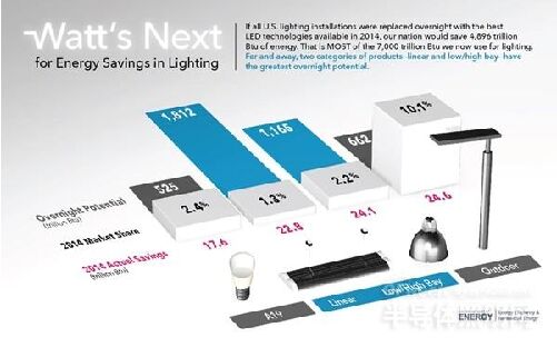 據(jù)悉,美國(guó)能源署(DOE)近日發(fā)布了一份題為《LED在普通照明應(yīng)用中的使用》的報(bào)告。這項(xiàng)報(bào)告不僅估算了2014年LED在10大照明應(yīng)用中的節(jié)能效果,還預(yù)估了這些照明應(yīng)用完全采用LED產(chǎn)品的節(jié)能潛力。 據(jù)報(bào)告顯示,由于LED光源的采用,2014年節(jié)約能源為143萬(wàn)億英熱單位(相當(dāng)于節(jié)省成本約14億美元),但如果所有應(yīng)用中的通宵照明產(chǎn)品都換成LED光源,將節(jié)約近4,896萬(wàn)億英熱單位(相當(dāng)于節(jié)省成本490億美元)。 2012-2014,LED在所有應(yīng)用中的安裝量增加,整體增幅超過(guò)四倍至215萬(wàn),但市場(chǎng)滲透率仍然不大,攀升至3%。小型定向LED光源仍然是市場(chǎng)份額的領(lǐng)先者,從2012年的10%增加到2014年的22%,增長(zhǎng)或在未來(lái)幾年放緩。2014年,LED光源占戶(hù)外應(yīng)用市場(chǎng)份額為10%,占室內(nèi)應(yīng)用市場(chǎng)份額為2.8%。