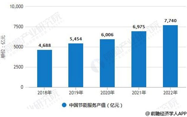 據(jù)前瞻產(chǎn)業(yè)研究院發(fā)布的《節(jié)能服務(wù)行業(yè)市場(chǎng)前瞻與投資戰(zhàn)略規(guī)劃分析報(bào)告》統(tǒng)計(jì)數(shù)據(jù)顯示,2017年中國(guó)節(jié)能服務(wù)產(chǎn)業(yè)產(chǎn)值達(dá)4148億元,全國(guó)從事節(jié)能服務(wù)的企業(yè)6137家,行業(yè)從業(yè)人數(shù)68.5萬(wàn)人,合同能源管理投資形成年節(jié)能能力超過(guò)3800萬(wàn)噸標(biāo)準(zhǔn)煤,年減排二氧化碳突破1億噸,節(jié)能服務(wù)產(chǎn)業(yè)繼續(xù)保持了良好發(fā)展勢(shì)頭。預(yù)計(jì)2018年我國(guó)節(jié)能服務(wù)業(yè)總產(chǎn)值將達(dá)到4688億元,未來(lái)五年(2018-2022)年均復(fù)合增長(zhǎng)率約為13.35%,預(yù)測(cè)到了2022年我國(guó)節(jié)能服務(wù)業(yè)總產(chǎn)值將達(dá)到7740億元。