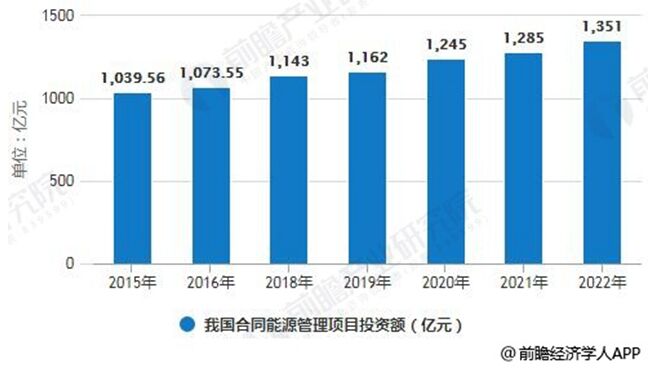 2015年,我國(guó)合同能源管理項(xiàng)目投資額為1039.56億元,同比增長(zhǎng)8.43%。到了2016年我國(guó)合同能源管理項(xiàng)目投資額為1073.55億元,同比增長(zhǎng)3.27%。綜合以上因素,預(yù)計(jì)2018年我國(guó)合同能源管理項(xiàng)目投資額將達(dá)到1143億元,未來(lái)五年(2018-2022)年均復(fù)合增長(zhǎng)率約為4.26%,預(yù)測(cè)到了2022年我國(guó)合同能源管理項(xiàng)目投資額將達(dá)到1351億元。