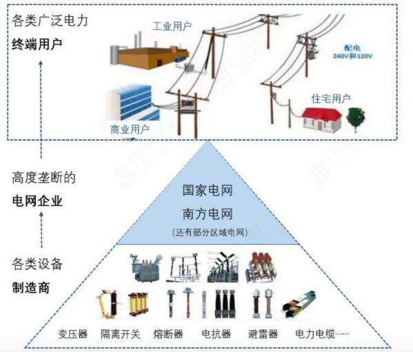電網(wǎng)產(chǎn)業(yè)鏈下游是廣泛的終端用戶,電網(wǎng)企業(yè)提供輸送電服務(wù),用戶向電網(wǎng)企業(yè)支付電費(fèi)(目前電網(wǎng)企業(yè)仍然是最主要的售電主體),根據(jù)電價(jià)的差異,大致可以將用戶分為:大工業(yè)、一般工商業(yè)、居民以及農(nóng)業(yè)生產(chǎn)四類,其中大工業(yè)和一般工商業(yè)用戶對(duì)應(yīng)的電價(jià)高于居民和農(nóng)業(yè)生產(chǎn)用電價(jià)。 中游是電網(wǎng)建設(shè)及運(yùn)營(yíng),傳統(tǒng)模式下電網(wǎng)企業(yè)進(jìn)行網(wǎng)架建設(shè)投資,通過(guò)購(gòu)售電價(jià)差,收回投資及賺取收益。 電網(wǎng)的上游包括建設(shè)環(huán)節(jié)的設(shè)備企業(yè)和運(yùn)營(yíng)環(huán)節(jié)的發(fā)電企業(yè)。其中電力設(shè)備企業(yè)不僅有硬件設(shè)備,也包括軟件,系統(tǒng)集成等。