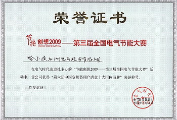 由電氣時(shí)代雜志社主辦,中國電機(jī)工程學(xué)會、中國電器工業(yè)協(xié)會變頻器分會、中國自動化學(xué)會協(xié)辦的“節(jié)能創(chuàng)想2009——第三屆全國電氣節(jié)能應(yīng)用技術(shù)論壇及第六屆變頻器用戶滿意十大品牌發(fā)布”在北京舉行。哈爾濱九洲電氣股份有限公司被評為“十大品牌”之一。此次發(fā)布會有來自電力、石化、冶金、水處理、水泥、煤炭、建筑、交通、紡織和通用機(jī)械等領(lǐng)域的專家及用戶代表等180多人參加。