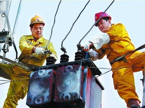 圖為員工正在更換變壓器。