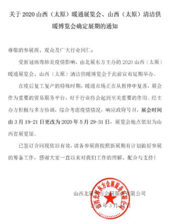根據(jù)新型肺炎疫情防控需要,為貫徹落實(shí)黨中央和山西省政府做好新型冠狀病毒感染的肺炎疫情防控工作,切實(shí)保障廣大參展商和觀眾及各界朋友們的健康安全,確保參展企業(yè)的參展效果和采購商的參觀體驗(yàn),原定于3月19-21日在山西舉辦的2020山西(太原)暖通展覽會延期至5月29-31日舉辦。