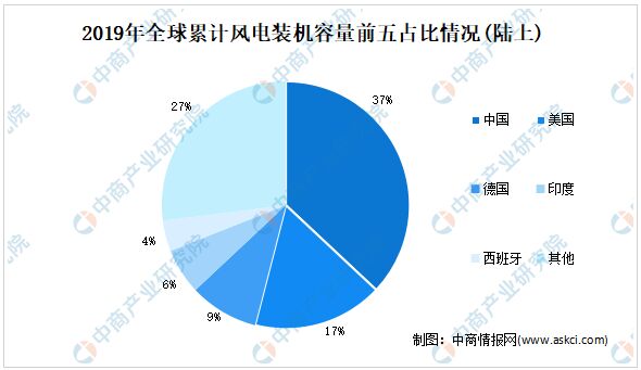 中國是全球風電裝機容量第一大國。數(shù)據(jù)顯示,截至2019年,中國累計風電裝機容量為236.40吉瓦,占全球累計風電裝機容量的36.34%。其中,陸上累計裝機容量229.56吉瓦,排名全球第一;海上累計裝機容量6.84吉瓦,排名世界第三。