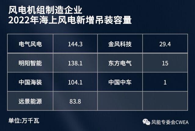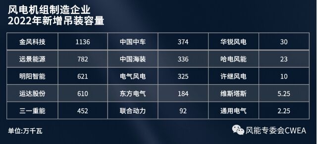 2022年,中國新增吊裝容量前五的風電機組制造企業(yè)是金風科技、遠景能源、明陽智能、運達股份、三一重能,其新增裝機容量分別為1136萬千瓦、782萬千瓦、621萬千瓦、610萬千瓦、452萬千瓦。