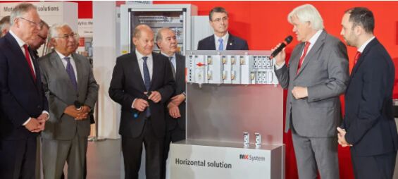 倍福全球總裁 Hans Beckhoff 向德國總理奧拉夫·舒爾茨和葡萄牙總理安東尼奧·科斯塔展示用于實(shí)現(xiàn)無控制柜自動(dòng)化的 MX 系統(tǒng)。