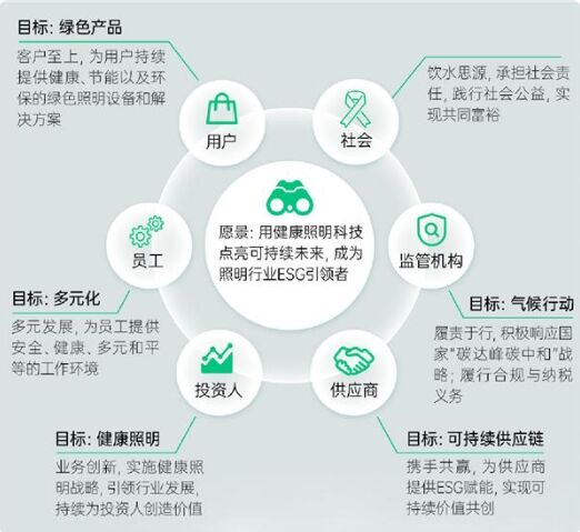 值得一提的事,雷士照明于近日正式發(fā)布了ESG治理體系,前瞻性地將ESG融入企業(yè)發(fā)展戰(zhàn)略。雷士照明構(gòu)建了科學(xué)、完善的ESG治理體系,包括“用照明科技點亮可持續(xù)未來,成為照明行業(yè)ESG引領(lǐng)者”的愿景及6大ESG戰(zhàn)略目標(biāo)、15個ESG議題,成立ESG專項管理委員會并制定覆蓋目標(biāo)管理、議題統(tǒng)籌、信息披露、風(fēng)險管理的ESG管理制度。