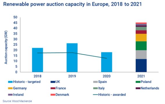 在經(jīng)歷了動(dòng)蕩的2020年之后,歐洲電力市場(chǎng)有望迎來(lái)較為樂(lè)觀的2021年。在新的一年里,歐洲各國(guó)的政策制定者和市場(chǎng)參與者將在歐美綠色協(xié)議的指引下,向著零凈排放的目標(biāo)有效推動(dòng)實(shí)質(zhì)性的進(jìn)程。預(yù)計(jì)2021年歐洲可再生能源競(jìng)標(biāo)將創(chuàng)下新的記錄。 根據(jù)Wood Mackenzie最新的一項(xiàng)分析,2021年歐洲計(jì)劃競(jìng)標(biāo)的總?cè)萘扛哌_(dá)45GW,其中包括17GW的風(fēng)電,6GW的光伏發(fā)電,以及技術(shù)中立的或多種可再生能源混合技術(shù)。 以往的競(jìng)拍結(jié)果表明,中標(biāo)總量可能低于目標(biāo)值。在過(guò)去的三年里,歐洲競(jìng)標(biāo)的平均成交率為70%,也就是說(shuō),2021年極有可能最終落地30GW的發(fā)電容量。