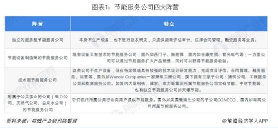 當(dāng)前中國節(jié)能服務(wù)行業(yè)發(fā)展還存在較大的缺陷,首先是規(guī)模小、發(fā)展水平低、市場競爭激烈。其次發(fā)展區(qū)域不均衡,東部地區(qū)遙遙領(lǐng)先;最后是市場競爭出現(xiàn)同質(zhì)化。 未來節(jié)能服務(wù)企業(yè)應(yīng)該在產(chǎn)業(yè)供應(yīng)鏈方向上整合資源,優(yōu)勢互補,對具有產(chǎn)業(yè)優(yōu)勢的企業(yè),實現(xiàn)兼并聯(lián)合,實現(xiàn)其產(chǎn)業(yè)優(yōu)勢的快速擴張,從而提升企業(yè)應(yīng)對市場的能力。 節(jié)能服務(wù)公司四大陣營,節(jié)能設(shè)備制造商的節(jié)能服務(wù)公司有較大優(yōu)勢 行業(yè)現(xiàn)狀來看,目前中國節(jié)能服務(wù)企業(yè)存在規(guī)模小、發(fā)展水平低,市場競爭激烈、整體的生存狀況較為惡劣的局面。未來在“互聯(lián)網(wǎng)++”戰(zhàn)略全面推薦的時代背景下,城市建設(shè)、園區(qū)建設(shè)將會更加注重以移動互聯(lián)網(wǎng)、物聯(lián)網(wǎng)、云計算、大數(shù)據(jù)等為代表的信息技術(shù)與城市及園區(qū)發(fā)展融合應(yīng)用。在產(chǎn)城融合的發(fā)展趨勢下,節(jié)能服務(wù)公司應(yīng)該有所探索和嘗試,為向智慧化發(fā)展提供思路。分析認為,節(jié)能服務(wù)公司大體可以分為四大陣營,如下表所示:
