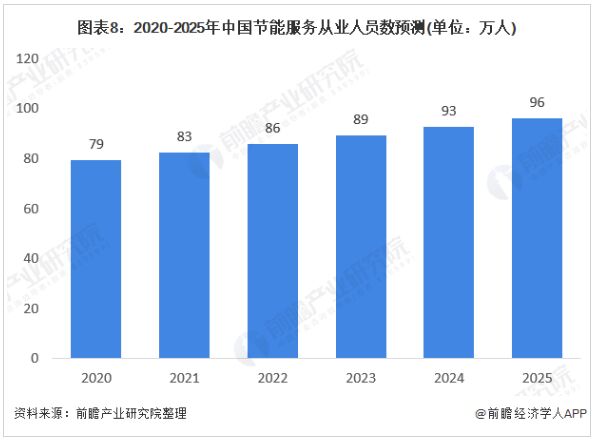 2019年EMCA的數(shù)據(jù)顯示,全國(guó)從事節(jié)能服務(wù)產(chǎn)業(yè)人員從2012年底43.5萬(wàn)人增長(zhǎng)到76.1萬(wàn)人。未來(lái),隨著節(jié)能服務(wù)產(chǎn)業(yè)規(guī)模的不斷擴(kuò)大,從業(yè)人員將呈現(xiàn)逐漸增多的趨勢(shì),但隨著行業(yè)對(duì)從業(yè)人員門檻的提高,增速仍將繼續(xù)放緩。預(yù)計(jì)2020年,全國(guó)節(jié)能服務(wù)產(chǎn)業(yè)從業(yè)人員將達(dá)到79萬(wàn)人,2025年,全國(guó)從事節(jié)能服務(wù)產(chǎn)業(yè)人員將超過(guò)96萬(wàn)人。